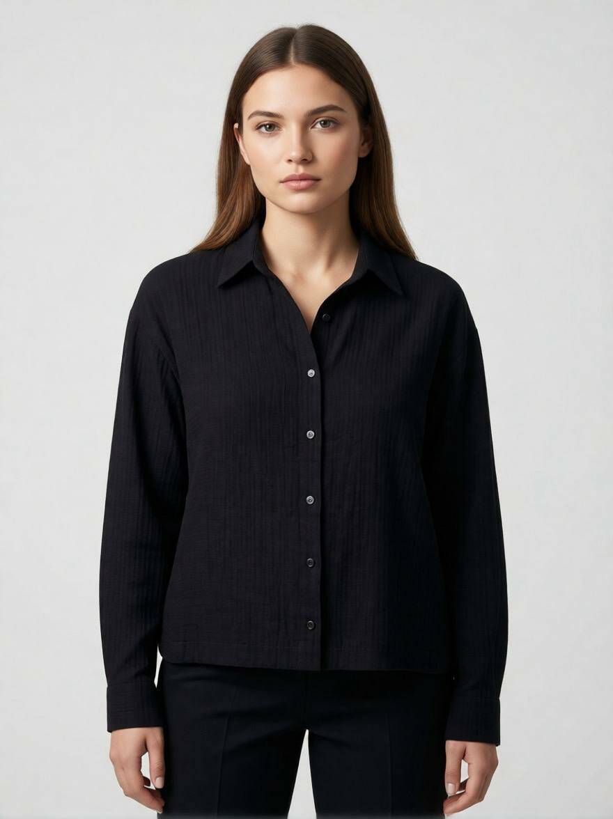 Чому це хіт? Чорна лляна сорочка — це універсальна база, яка виглядає менш формально, ніж класична офісна сорочка, але значно стильніше. Укорочений фасон додає моделі сучасності, дозволяючи легко трансформувати образ із денного у вечірній.