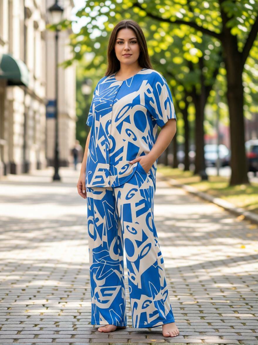 Насичений електрик у поєднанні з абстракцією — це справжній маніфест яскравості. Костюм привертає увагу та заряджає позитивом. Завдяки продуманому крою сорочки та високій посадці штанів, образ виглядає гармонійно та сучасно. Цей варіант для жінок, які не бояться бути в центрі уваги та обирають комфорт без компромісів.