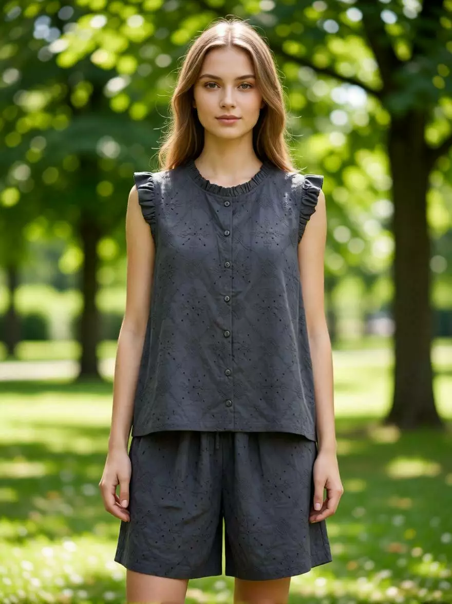 Вишуканий та стильний літній костюм-двійка з натуральної тканини в класичному чорному кольорі. Ця модель поєднує в собі елегантність відтінку та грайливість ажурного візерунка, створюючи неповторний образ для будь-якої ситуації.