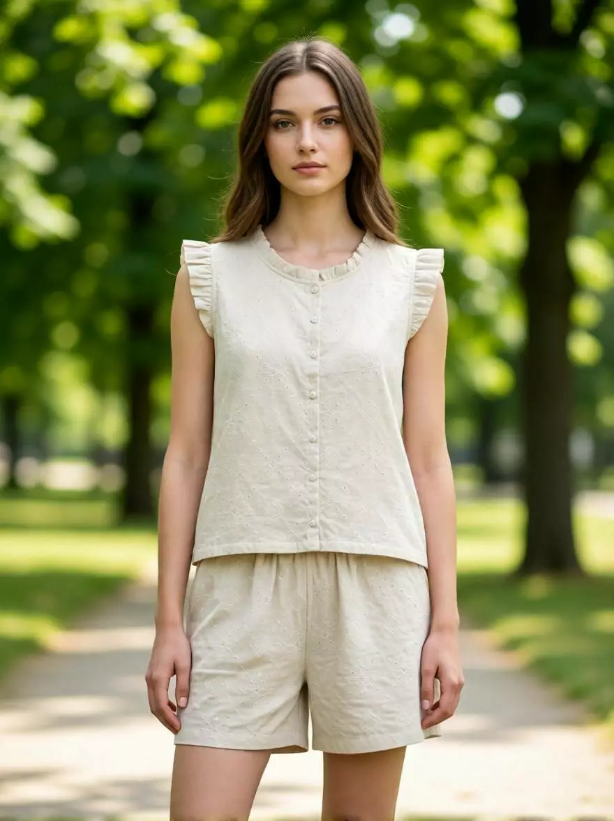 Елегантний та дуже ніжний літній костюм у світло-бежевому (кремовому) відтінку. Це ідеальна альтернатива білому кольору — виглядає так само свіжо, але більш м'яко та шляхетно. Натуральна тканина та вільний крій роблять його незамінним для літньої спеки.