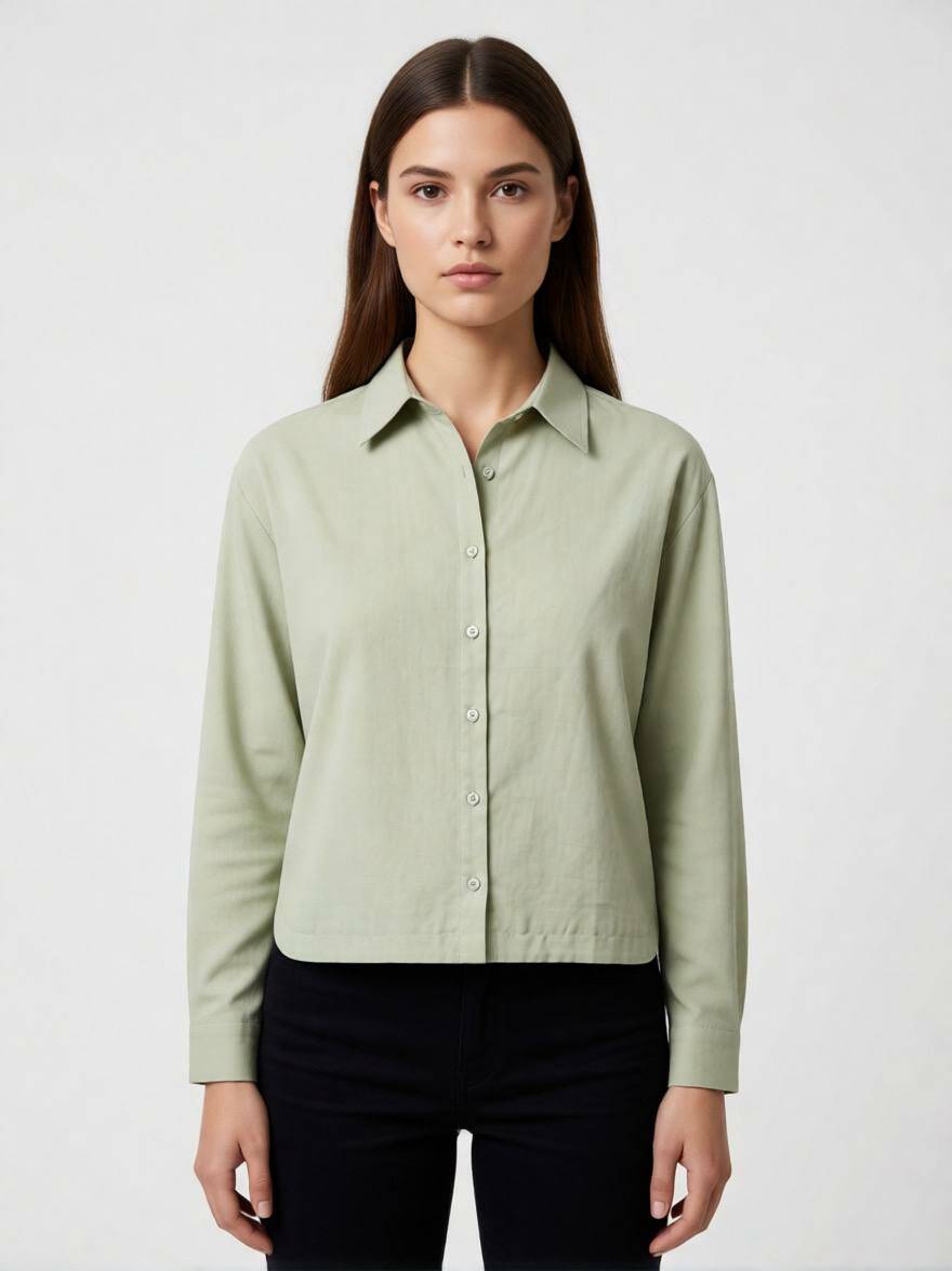 Стильна жіноча сорочка укороченого крою в елегантному оливковому кольорі. Модель поєднує в собі натуральність матеріалу та сучасний фасон, що ідеально підходить для створення багатошарових образів із високою посадкою штанів або спідниць.