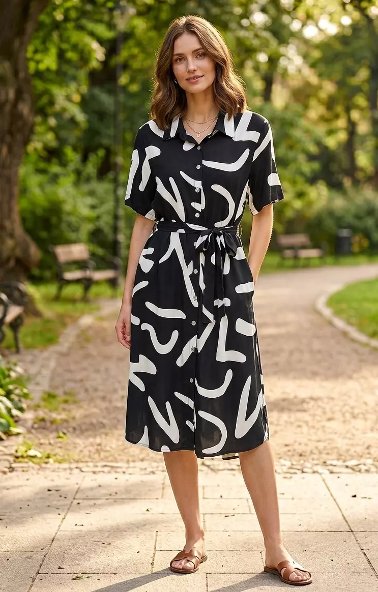 Стильне чорне платье-рубашка з поясом підкреслює талію та додає образу елегантності. Контрастний абстрактний принт робить модель сучасною та універсальною для повсякденного носіння.