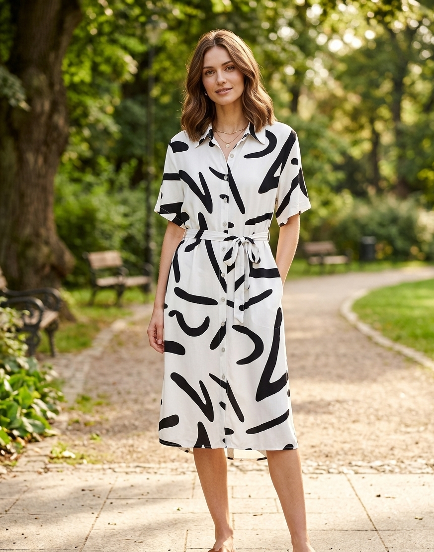 Елегантне біле платье-рубашка з поясом підкреслює талію і створює жіночний силует. Модель оснащена класичним коміром та ґудзиками спереду. Легка тканина штапель забезпечує комфорт у щоденному носінні та літніх прогулянках.