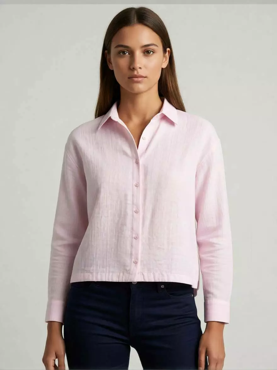 Витончена жіноча сорочка укороченого фасону в ніжному пудровому кольорі. Виконана з натурального льону, ця модель поєднує в собі м’якість відтінку та природну фактуру тканини, створюючи легкий, романтичний та водночас сучасний образ.