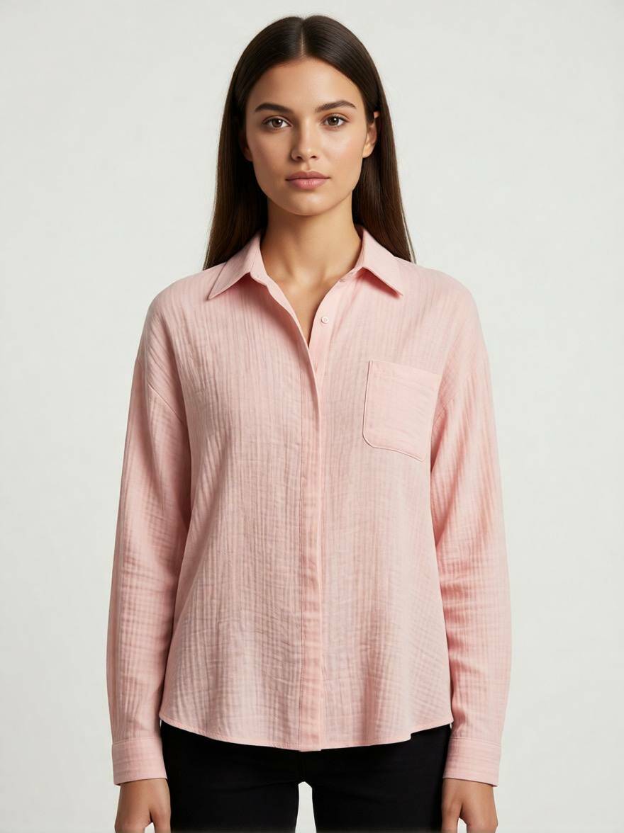 Ніжна та невагома сорочка великого розміру у романтичному пудровому відтінку. Муслінова тканина дарує відчуття прохолоди влітку та тепла навесні, а м'який колір додає образу свіжості та жіночності.