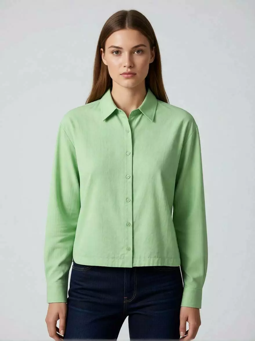 Тренд сезону — укорочена жіноча сорочка з натурального катону в енергійному салатовому кольорі. Соковитий відтінок у поєднанні з модним кроєм створює незабутній образ, що притягує погляди.