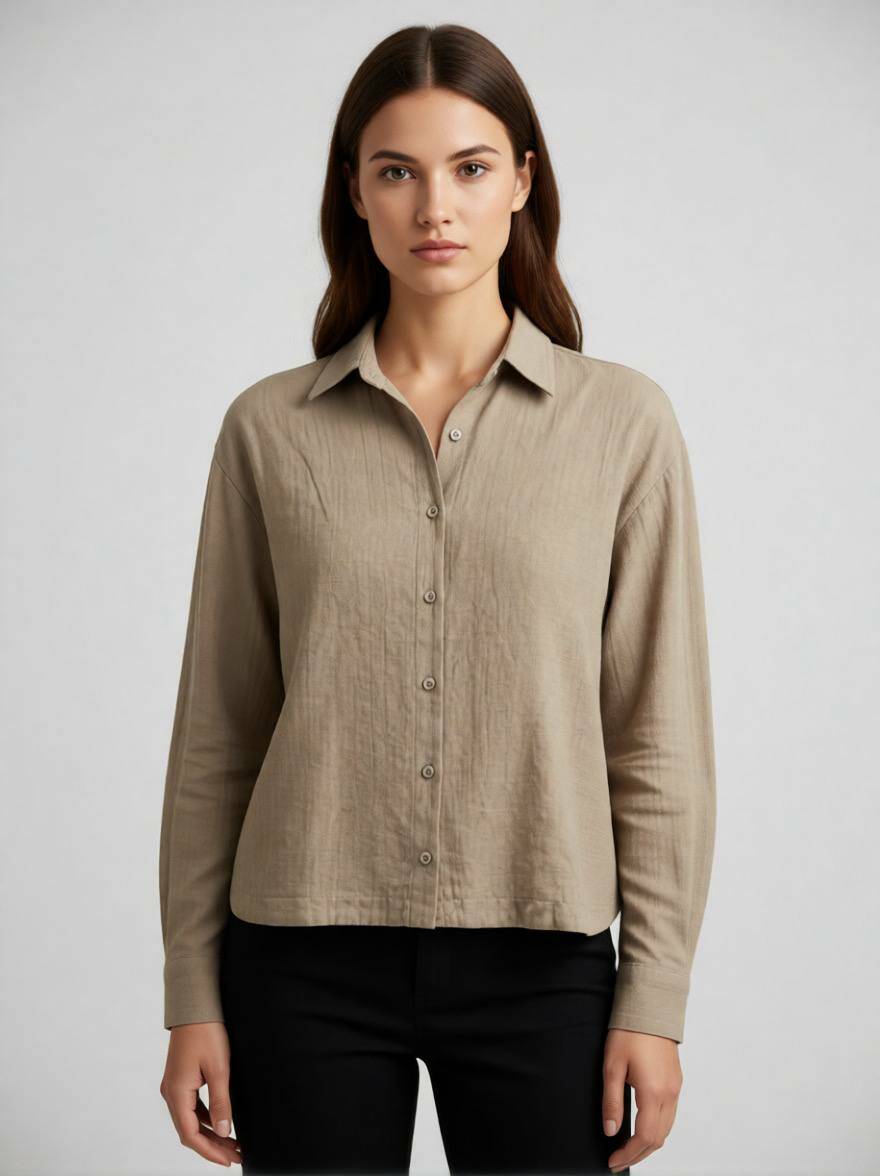 Елегантна жіноча сорочка укороченого крою в універсальному та глибокому кольорі моко. Виконана з натурального льону, ця модель поєднує в собі природний комфорт та витончену палітру, створюючи ідеальну базу для сучасного міського гардероба.