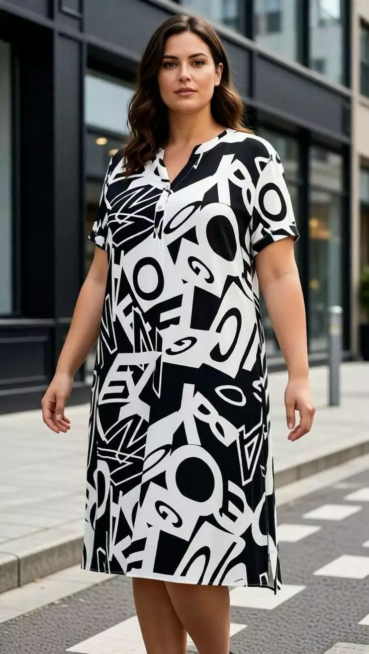 Стильна та свіжа модель з переважаючим білим кольором та чітким чорним лого-принтом. V-подібний виріз горловини з декоративною планкою візуально подовжує шию, а вільний крій приховує будь-які нюанси фігури.