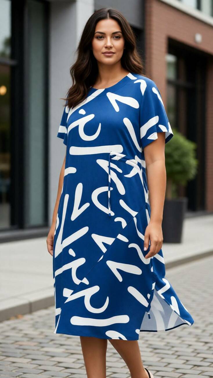 Елегантна жіноча сукня батал у темно-синьому кольорі з трендовим абстрактним принтом. Модель має вільний силует, що забезпечує максимальний комфорт та стильний вигляд.