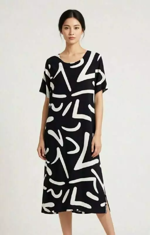 Стильна універсальна сукня з контрастним графічним принтом. Легка тканина дарує комфорт у спекотну погоду, а вільний силует гарно виглядає на різних типах фігури.