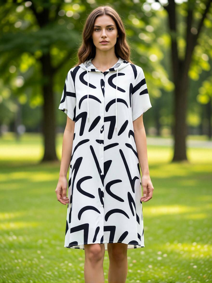 Легка повсякденна сукня-халат із капюшоном у сучасному мінімалістичному стилі. Контрастний графічний принт додає образу виразності, а вільний крій забезпечує комфорт та свободу рухів. Ідеальний варіант для прогулянок, відпочинку та щоденного носіння в теплу пору року.