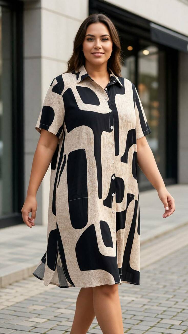 Вишуканість природних відтінків. Стильне поєднання пісочного бежу та глибокого чорного кольору виглядає дорого та стримано. Таке плаття підійде жінкам, які цінують стиль «тиха розкіш». Малюнок у вигляді великих ліній додає образу сучасності та художнього шарму.
