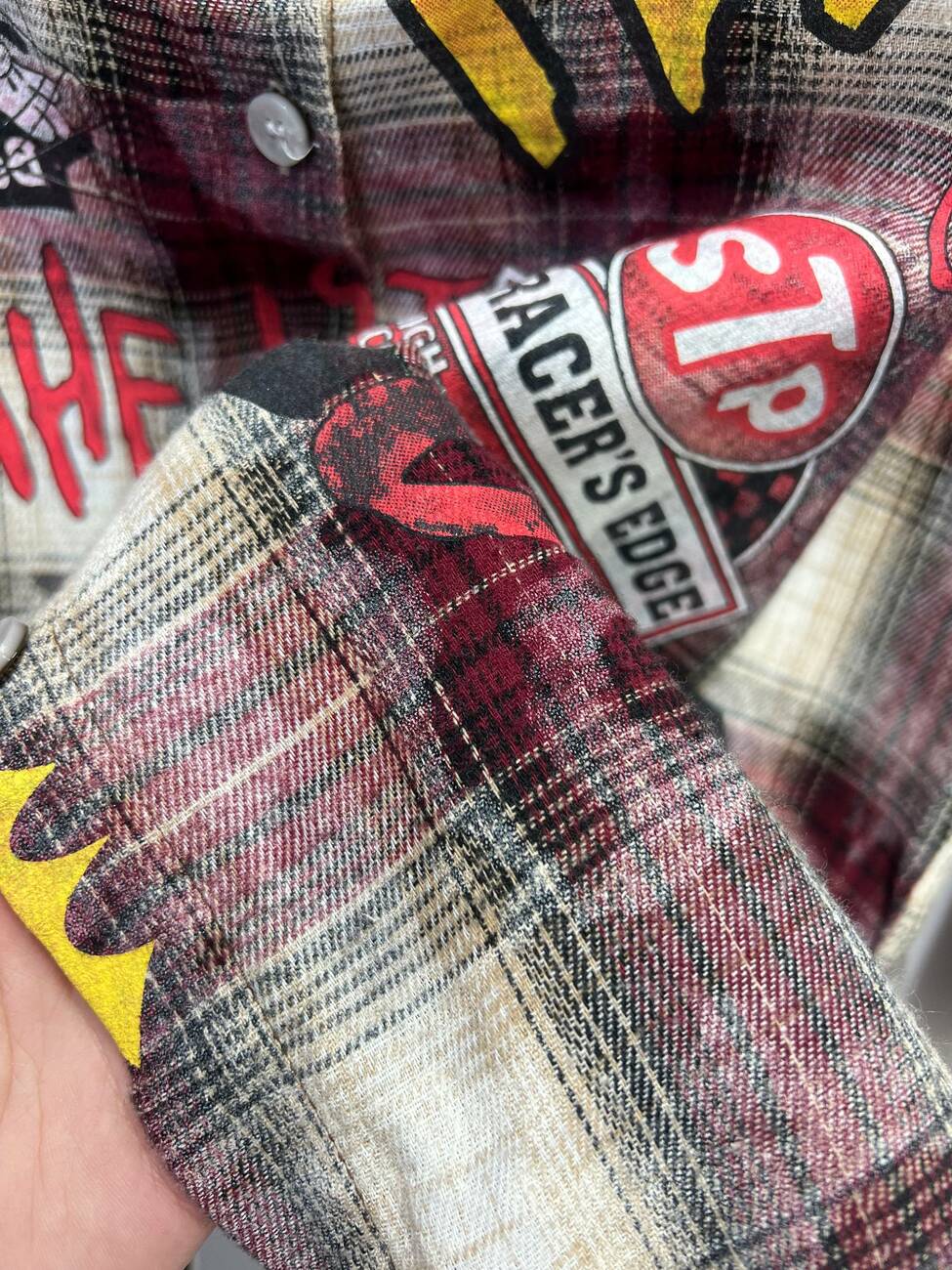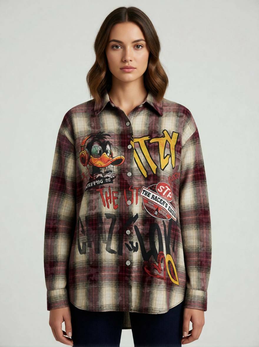 Стильна жіноча сорочка в стилі Oversize Grunge у глибокому бордовому відтінку. Поєднання класичної клітинки, ефекту «варенки» та зухвалих принтів робить цю модель хітом вуличної моди.