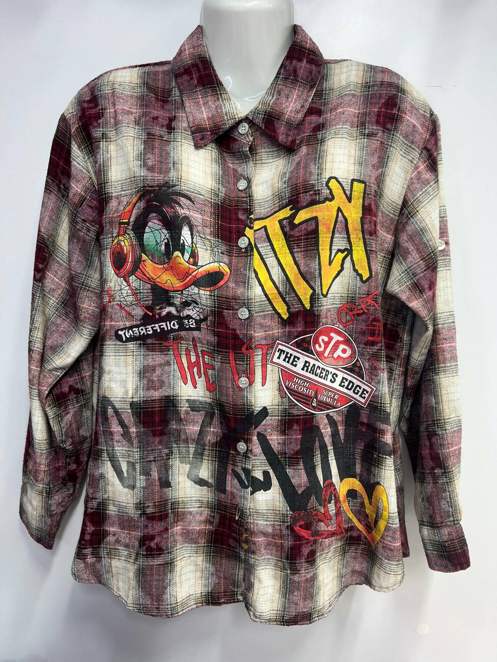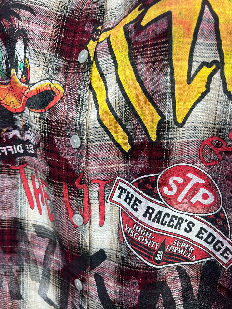 Дизайн: Принт Даффі Дак, написи у стилі графіті, виварений ефект тканини.