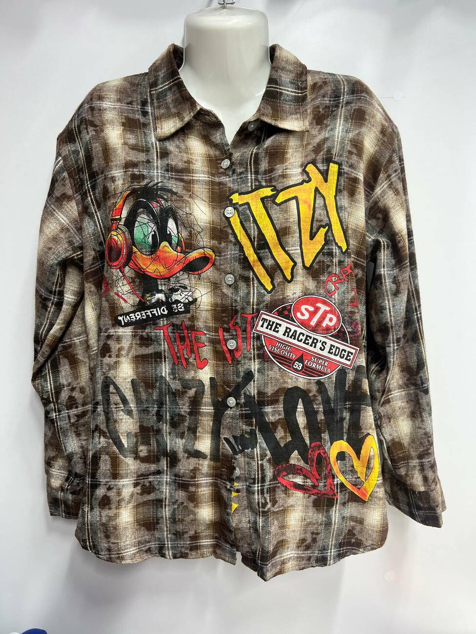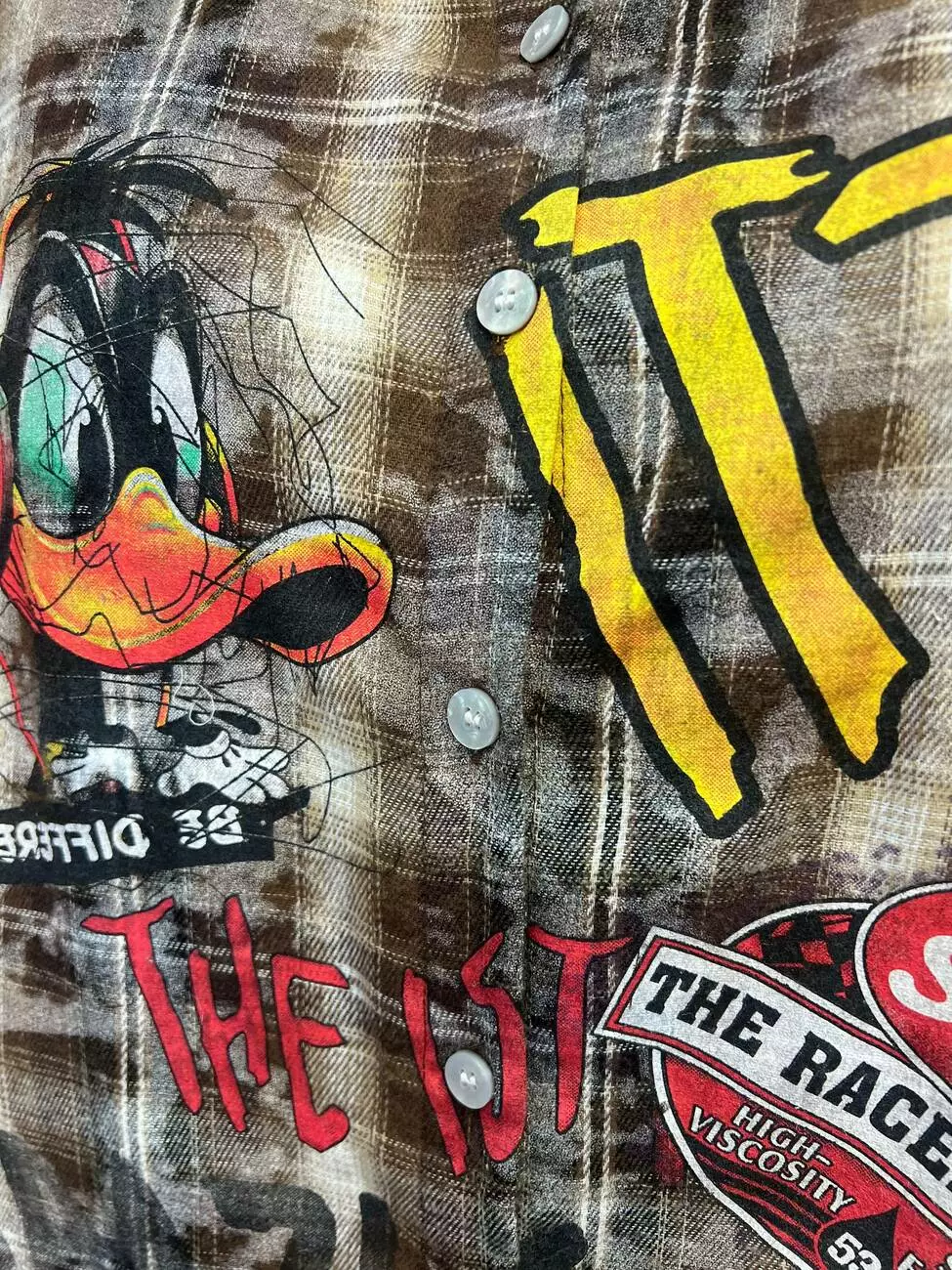 Дизайн: Принт Даффі Дак, написи у стилі графіті, виварений ефект тканини.