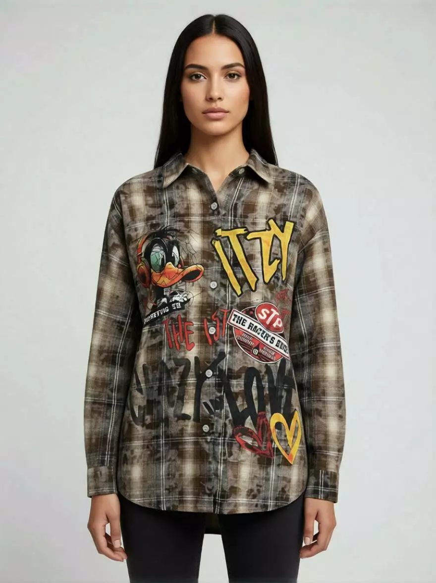 Стильна жіноча сорочка в стилі Oversize Grunge. Поєднання класичної клітинки, ефекту «варенки» та зухвалих принтів робить цю модель хітом вуличної моди.