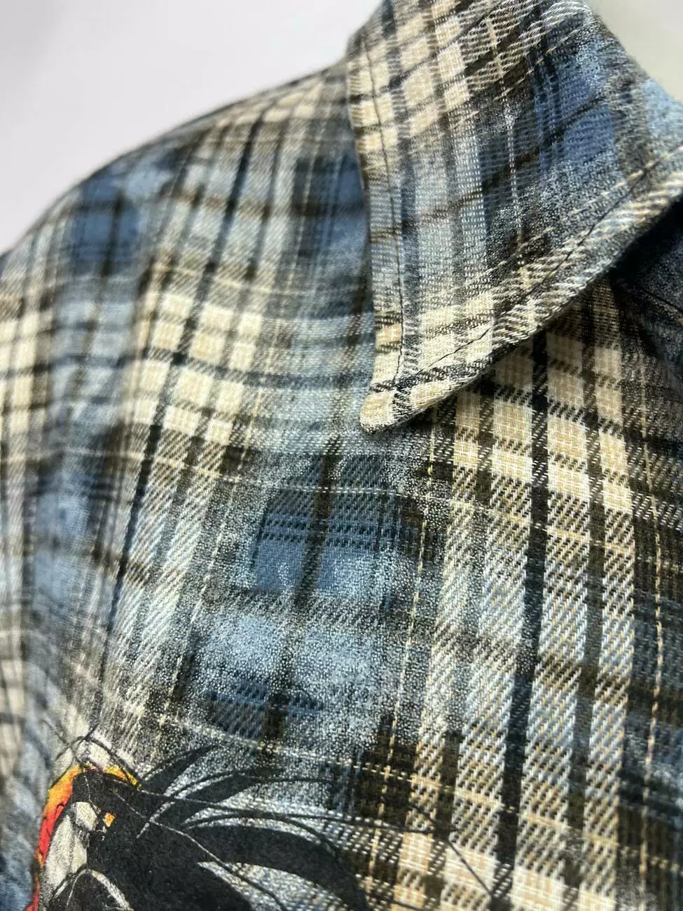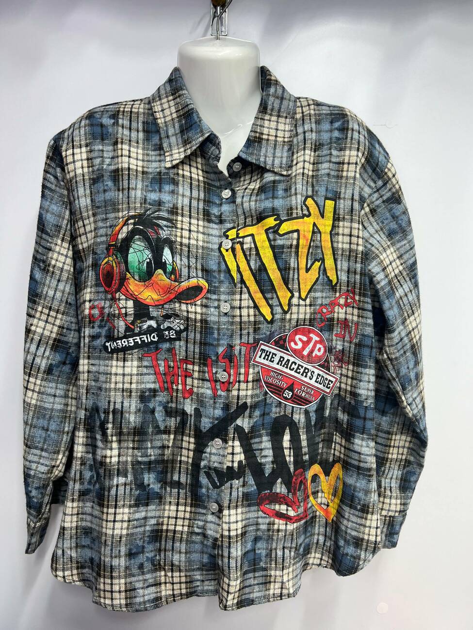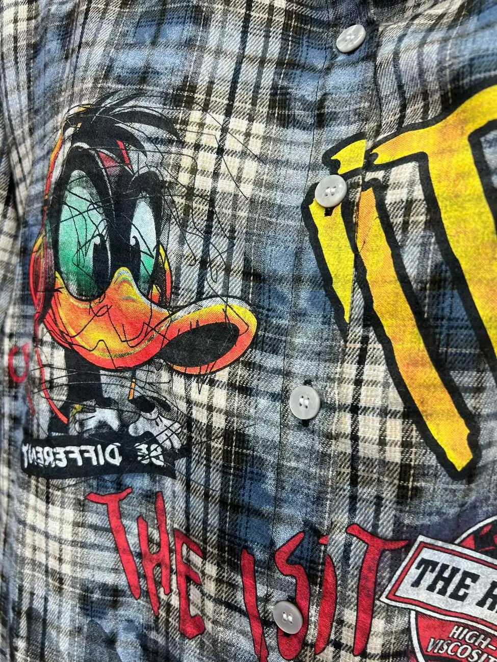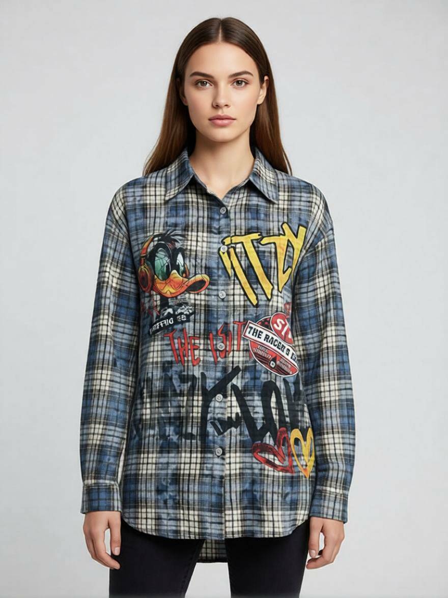 Трендова жіноча сорочка у ніжному блакитному кольорі. Модель у стилі Oversize Grunge поєднує класичну клітинку, виварений ефект тканини та яскраві графіті-принти.