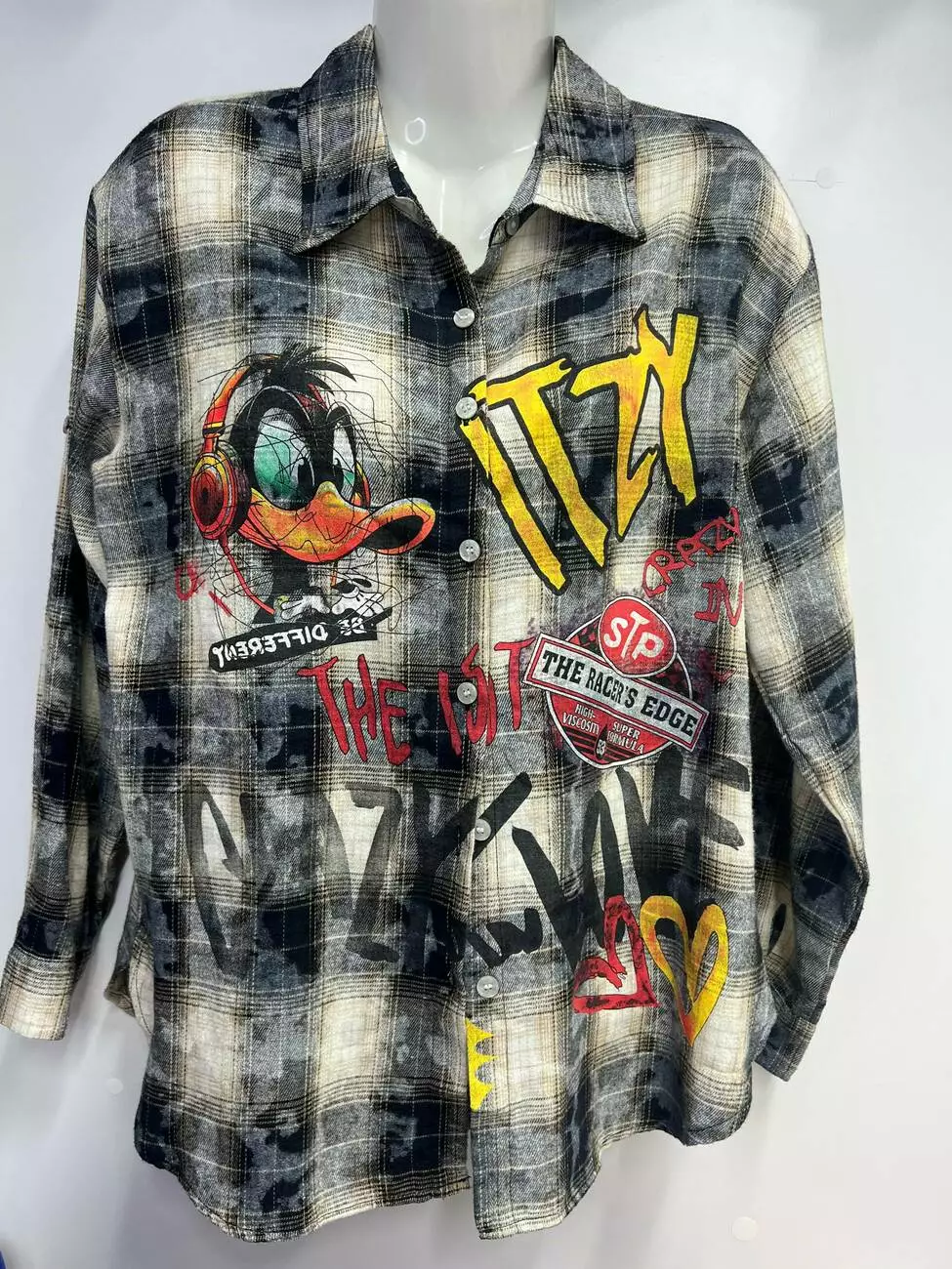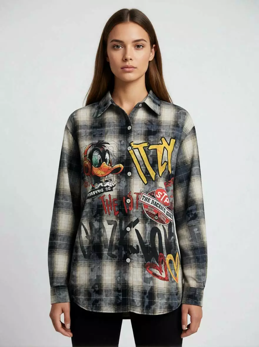 Дизайн: Культовий принт Даффі Дак, графіті-написи "CRAZY LOVE", "ITZY" та сучасні акценти.