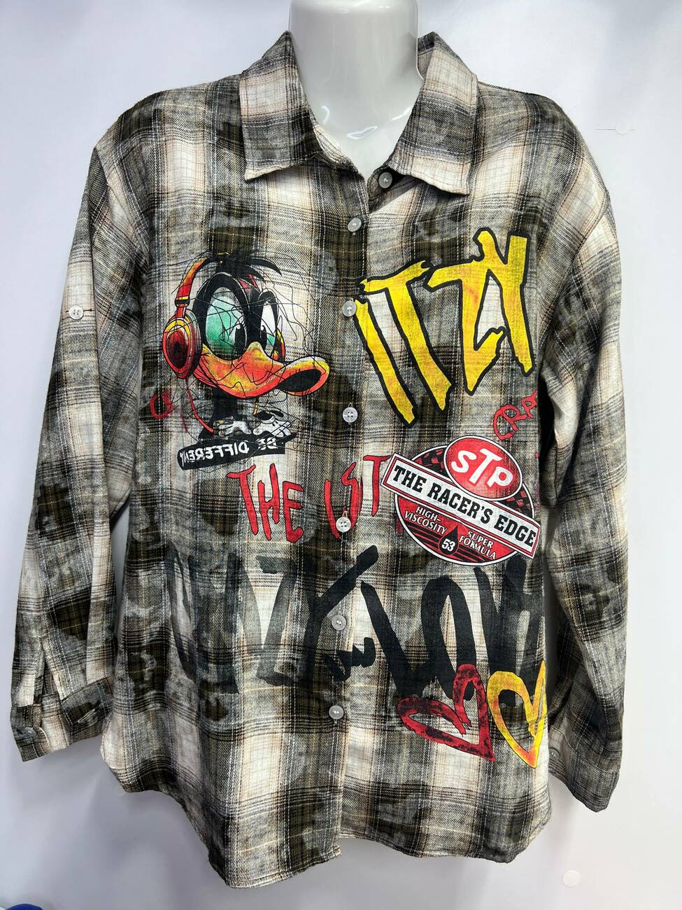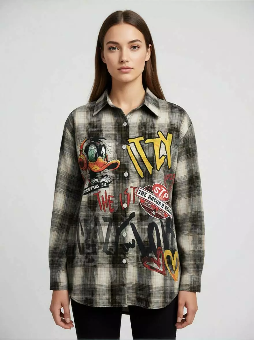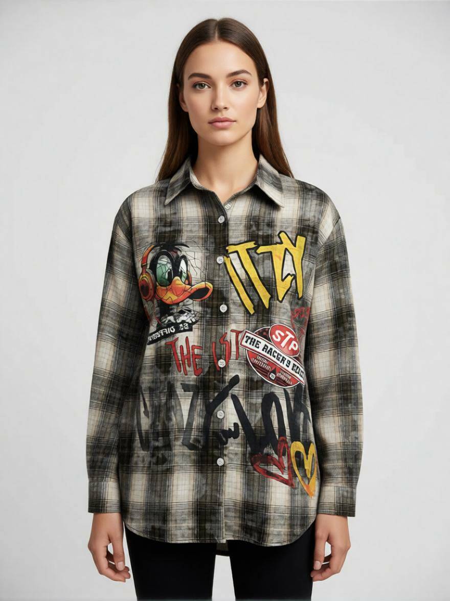Дизайн: Культовий принт Даффі Дак, графіті-написи "CRAZY LOVE", "ITZY" та сучасні акценти.
